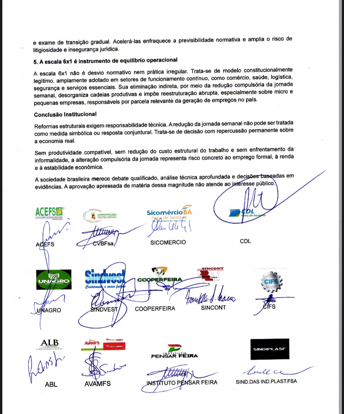 ACEFS e entidades empresariais de Feira de Santana se posicionam sobre proposta de redução da jornada